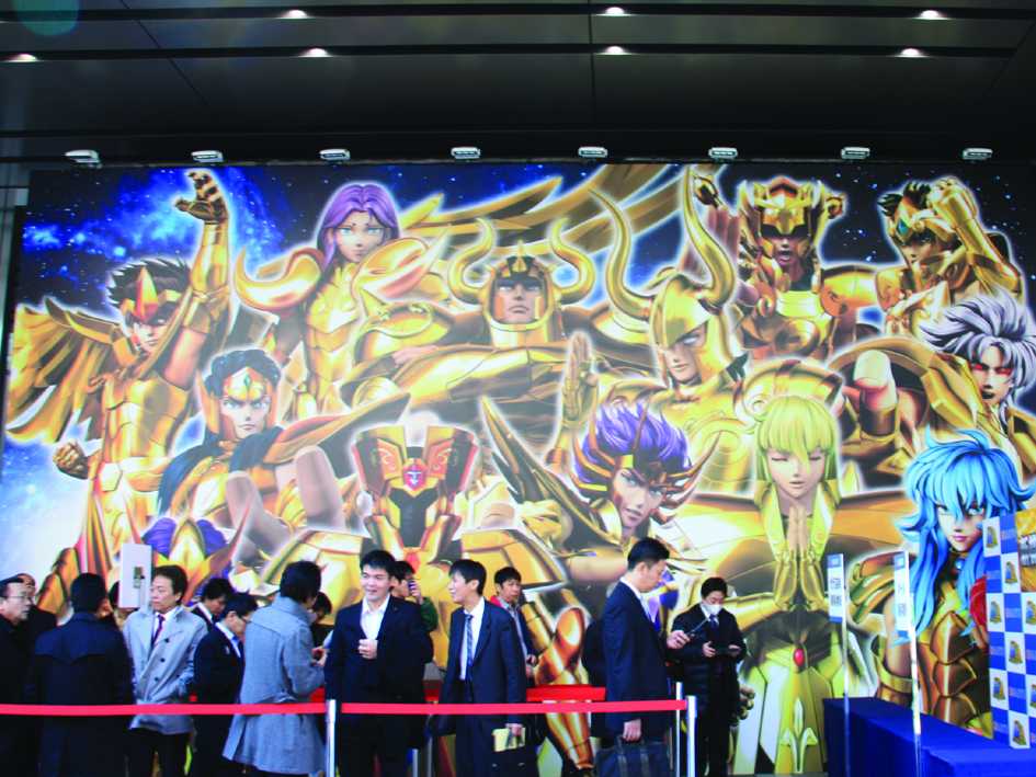 会場の外に展示された黄金聖衣(ゴールドクロス)では、道行く人が次々に記念撮影。中には旅行者らしき外国人の姿も。さすがは聖地、秋葉原!