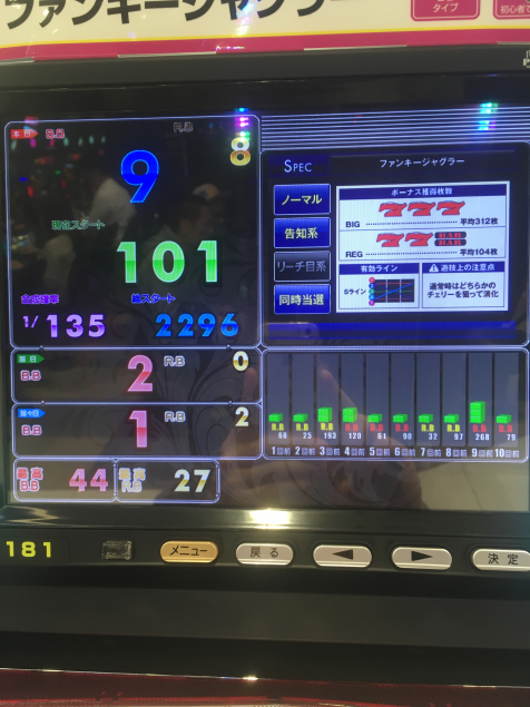 まぁ打ち足りなくて、会員カードもないから換金するのもなんなんで打つことに。どうもブドウがすこぶるよく落ちる。50枚で50Gぐらい回るんで追銭1kでペカ。268GでB。そこからうまいことジャグ連してくれて5連。追える。もうちょい打とうか。で、結果R3連くらってやめ。