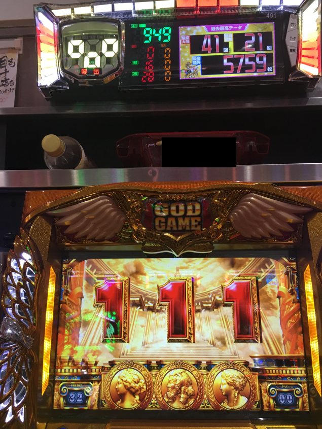 結論から言いますと宵越し天井で当たりまして、当日1057Gに1揃いGG(救済発動も確認済み)で、途中中段黄7で1個乗せるも…。
