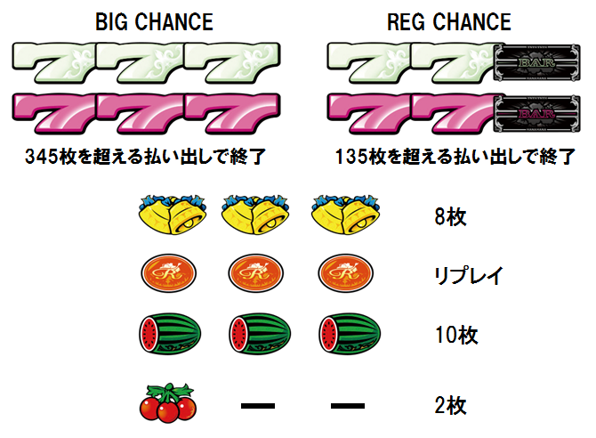 REG CHANCEの純増は最大で130枚。こちらもサイドランプ点滅時は取りこぼしに注意しよう。 また今作もビタ押しでスイカを獲得した後のサイドランプの点滅の仕方によって設定が示唆される。左リール中段に白7をビタ押しし、中・右でスイカを獲得すればOK。ただしこの示唆は1回のREGにつき、最初に揃えたスイカのみで発生する。