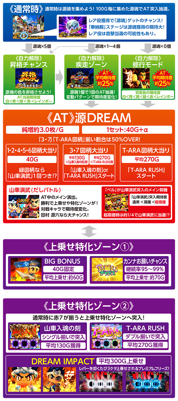 | 詳細 | ★源魂1つにつきATを1回抽選 ★所持している源魂が多いほどAT当選に期待できる ★ゾーン中はパチンコ演出が発生し、液晶で図柄が揃えばAT確定!! |