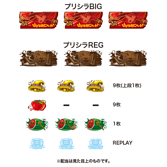 | 備考 | ★カットイン発生で魔方陣図柄揃いのチャンス ★魔方陣図柄が揃えば液晶左の宝玉ランプが点灯 ★5個目のランプ(中央ランプ)点灯でプリシラボーナスをストック ★ボーナス後は点灯した宝玉ランプの色対応の小役が強化される ★ボーナス後の小役強化状態は最低18G継続し、19G以降は転落抽選 |