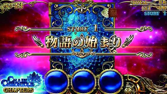 サミー6号機第1弾を飾るマシン。1Gあたりの純増が約4.0枚のAT「チェインクロニクルチャプターズ」にて出玉を獲得していくマシンだ。