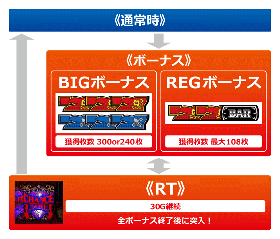 BIGは2種類あり、赤7BIGが300枚、青7BIGが240枚獲得となる。RTへは全ボーナス終了後に突入し、消化中はチャンス目の出現率がアップする。