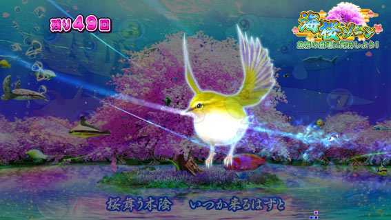 リーチ後のボタンPUSHでは基本的に泡or魚群が発生。当然、魚群の方が期待できる。ボタンPUSHで夜桜全回転リーチへ発展することも!