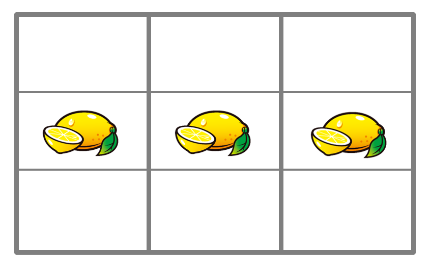 レモン中段の形。5号機リノでは1リール連チャン状態確定目でしたが、今作では普通に止まります。ここでの対応役では、レモン小V(4枚役)or中段レモン(15枚)orリーチ目1枚役になります。