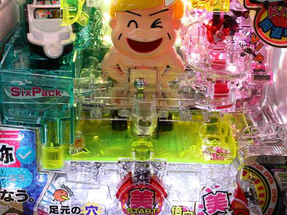 玉がSixPackステージに乗ると変動スタートのチャンス。役モノ中央の可動体に弾かれた玉が中央の穴に入ると美スタート入賞濃厚となる。