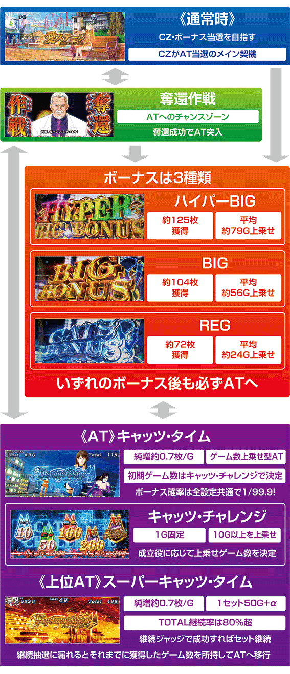 ボーナスは3種類あり、BIG・REG中は技術介入要素アリ。ビタ押し成功でゲーム数上乗せとなるぞ。また、通常時はキャッツ目という、いわゆる「ゼロボーナス」が存在。ゼロボーナス消化中はAT抽選が行われ、奪還作戦突入でATのチャンスだ。