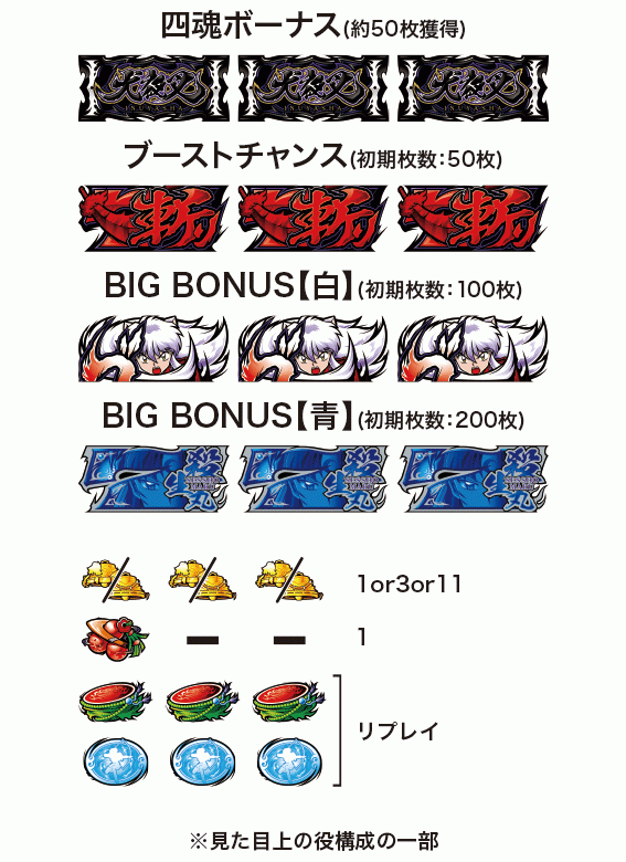 | 備考 | ★成立役を参照してAT抽選 ★BAR揃いorブッた斬り目出現でAT当選 ★四魂ボーナス・鉄砕牙チャンスを併せた実質的なAT期待度は約41% |