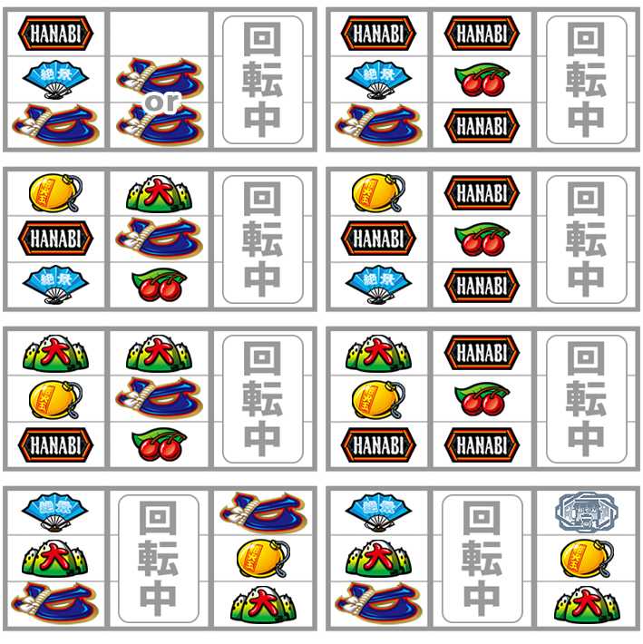 小役狙い手順実践時は中リールに青七orBAR・チェリー・BARを狙えば単独1枚役を出目から判別可能。花火百景ステージ中は単独1枚役の25%でボーナスに繋がるため、上記の出目を狙ってみるのもアリだろう。